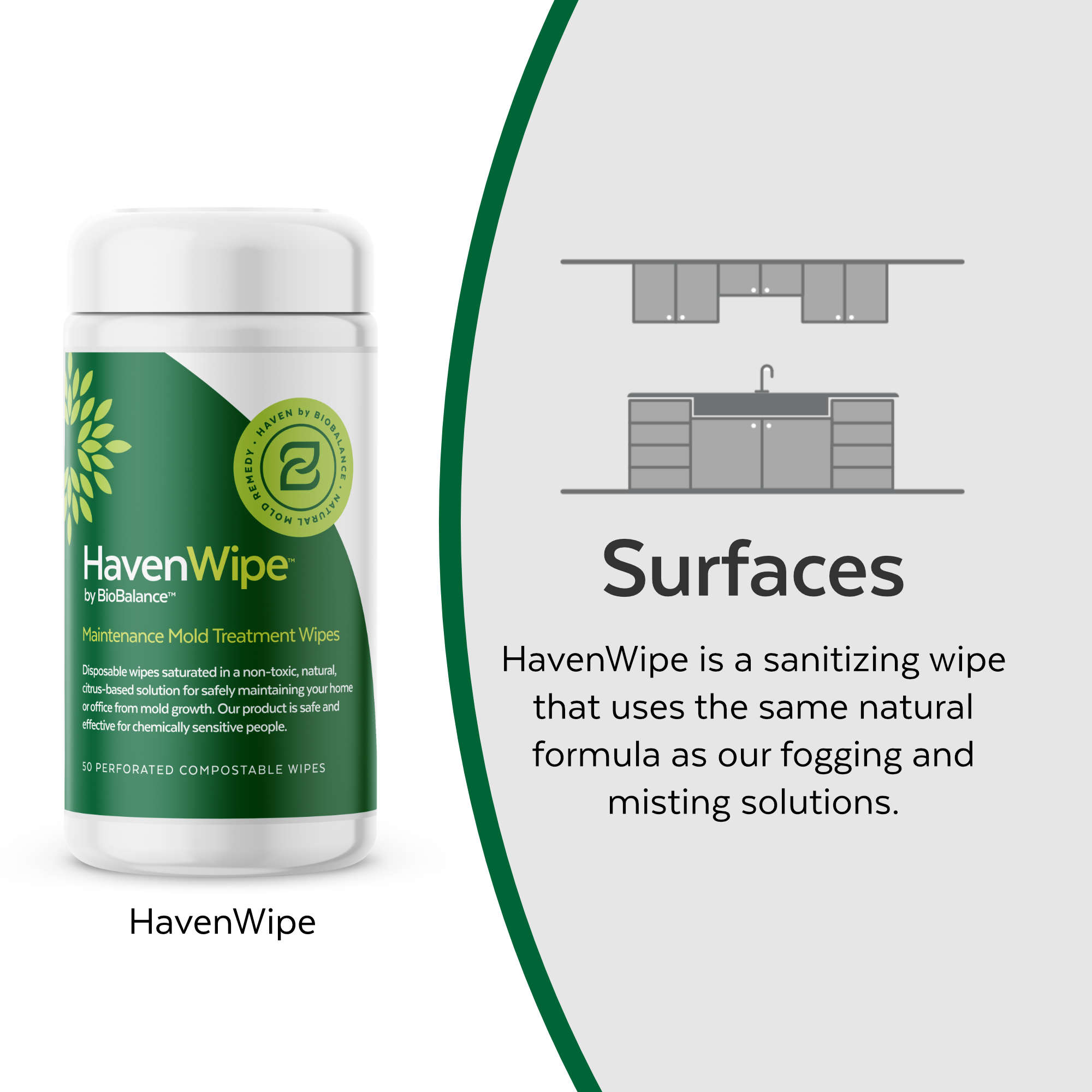 • HavenWipe™ – mold treatment wipes for everyday mold maintenance and small particulate clean-up following airborne mold treatment